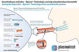 With Openair-Plasma® pre-treatment, however, 2C injection molding can be used by the toy industry without worry and without toxic materials. This plasma system is integrated directly in the extrusion tool and selectively modifies the exact spot where the soft component will be subsequently bonded (plastic bonding agent).