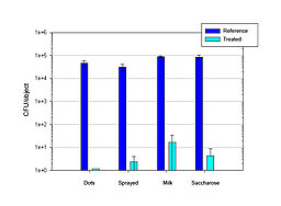 Inactivation of Aspergillus niger DSM 1957 conidia in different germination scenarios (dots, sprayed, milk, saccharose) with nitrogen as the process gas (track: 1 mm; jet spacing: 10 mm; speed: 10 m/min; PCT (plasma cycle time): 100%; gas flow: 2000 L/h).